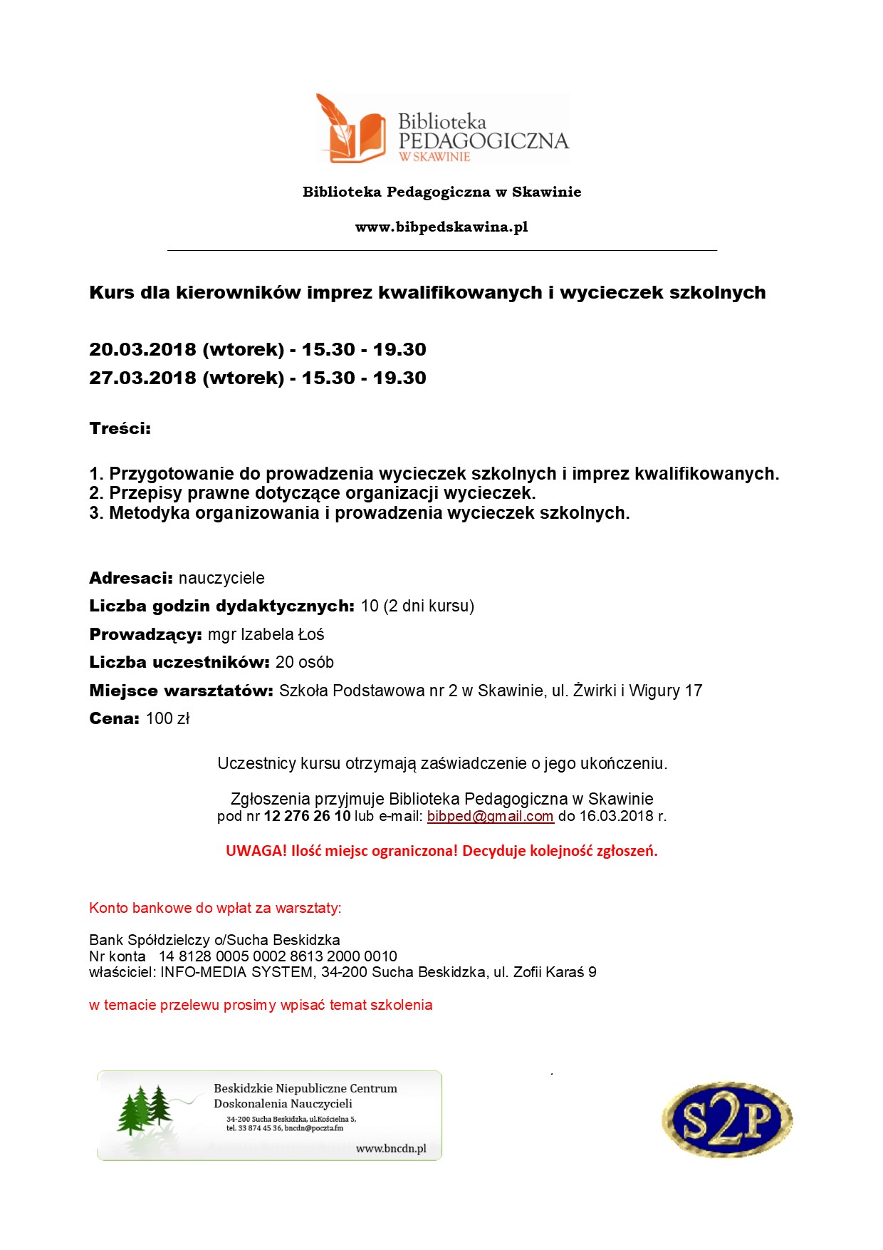 Zgłoszenia przyjmuje Biblioteka Pedagogiczna w Skawinie pod nr 12 276 26 10 lub e-mail: Ten adres pocztowy jest chroniony przed spamowaniem. Aby go zobaczyć, konieczne jest włączenie w przeglądarce obsługi JavaScript. do 16.03.2018 r.